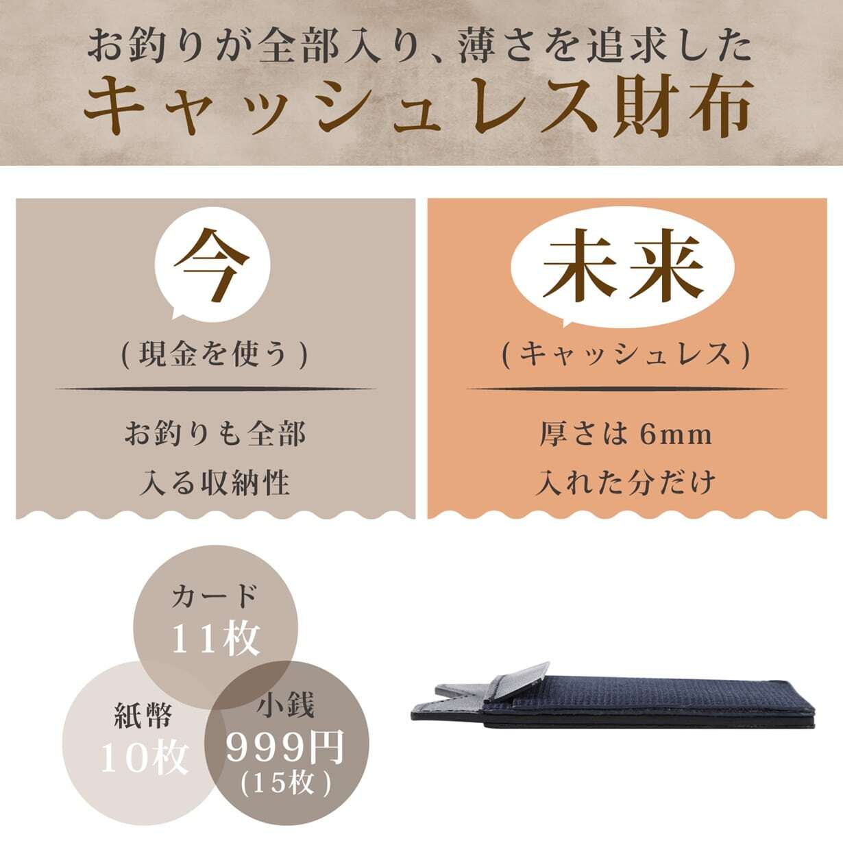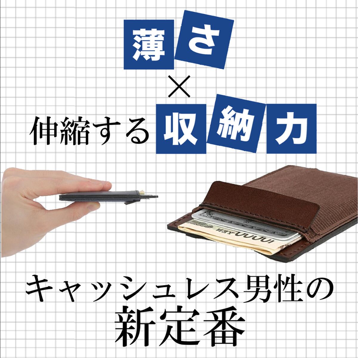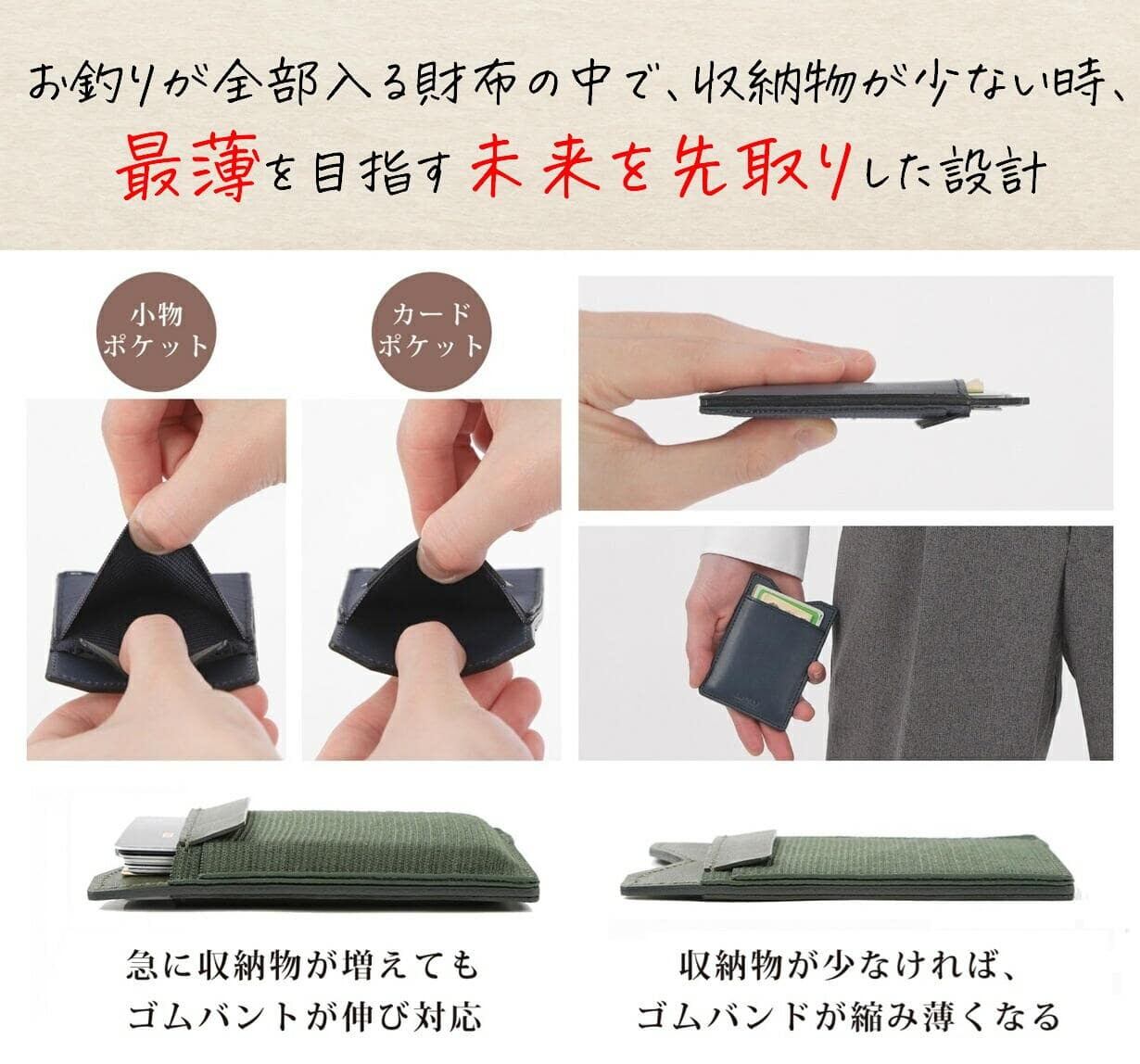 長財布でも、折りたたみ財布でもない、時が流れるほど、キャッシュレス財布として薄くなる財布 厚さ6mmでも、薄さと収納力を調整でき、カード・紙幣・小銭・鍵・紛失防止タグ、全て収納できる 薄くて小さなサイズながら、弾性バンドを使用することで、カード・紙幣・小銭・鍵・紛失防止タグ、全て収納でき、収納物が少なければ、厚さが6mmに近づき、より薄くなる財布です。