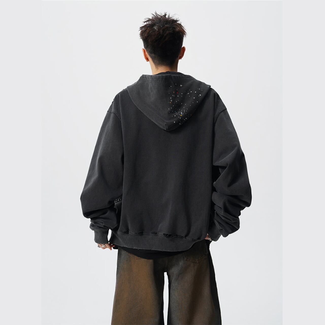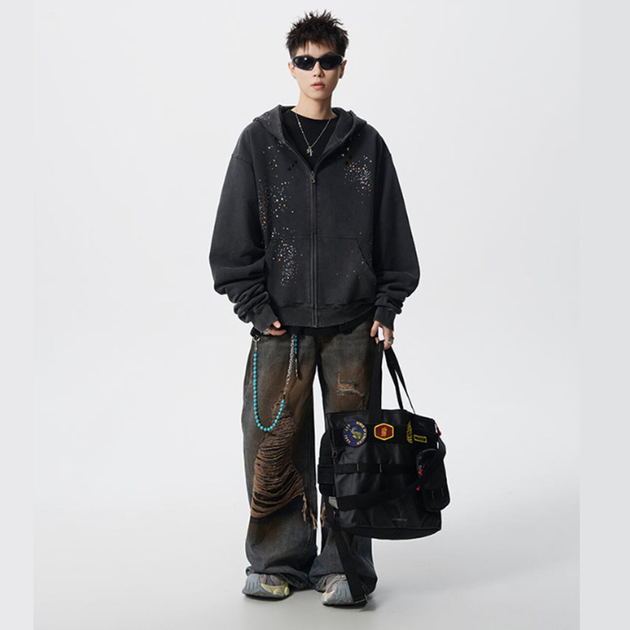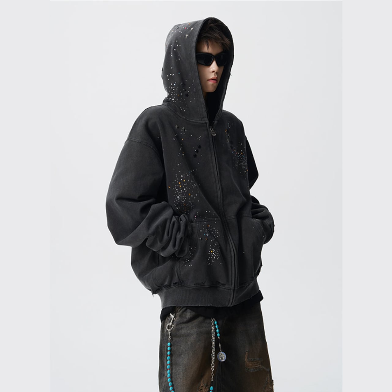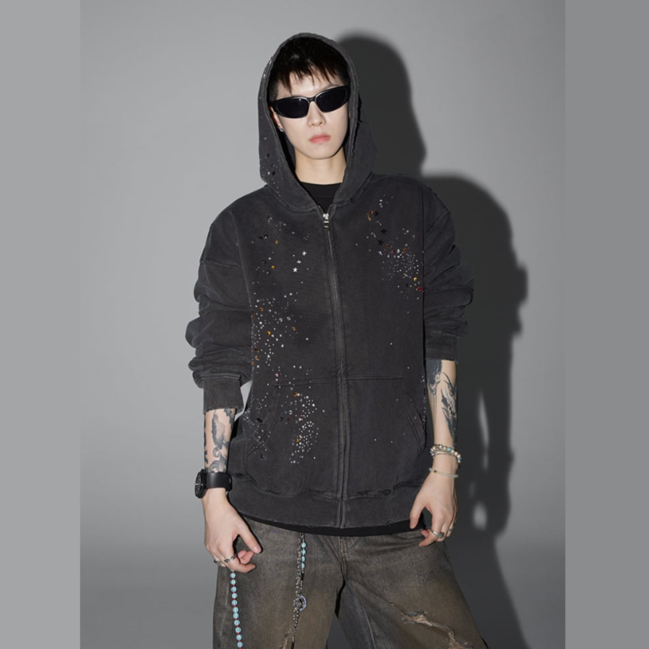 ラインストーン スタッズ ダメージ加工 ジップアップパーカーは、個性的なダメージ加工と煌びやかなラインストーンスタッズが特徴的なアイテムです。このパーカーを着ることで、カジュアルながらもセンスのあるスタイルを演出できます。