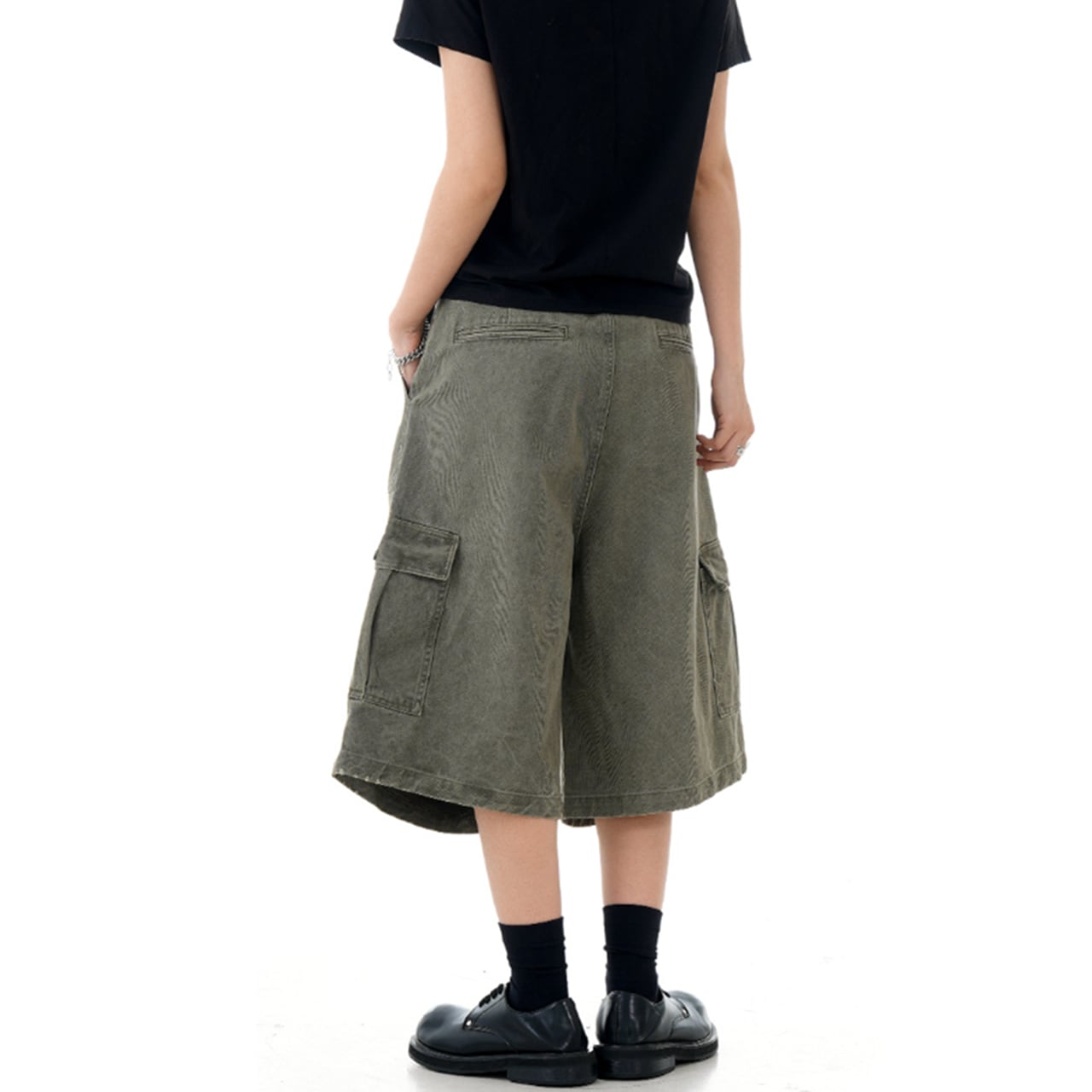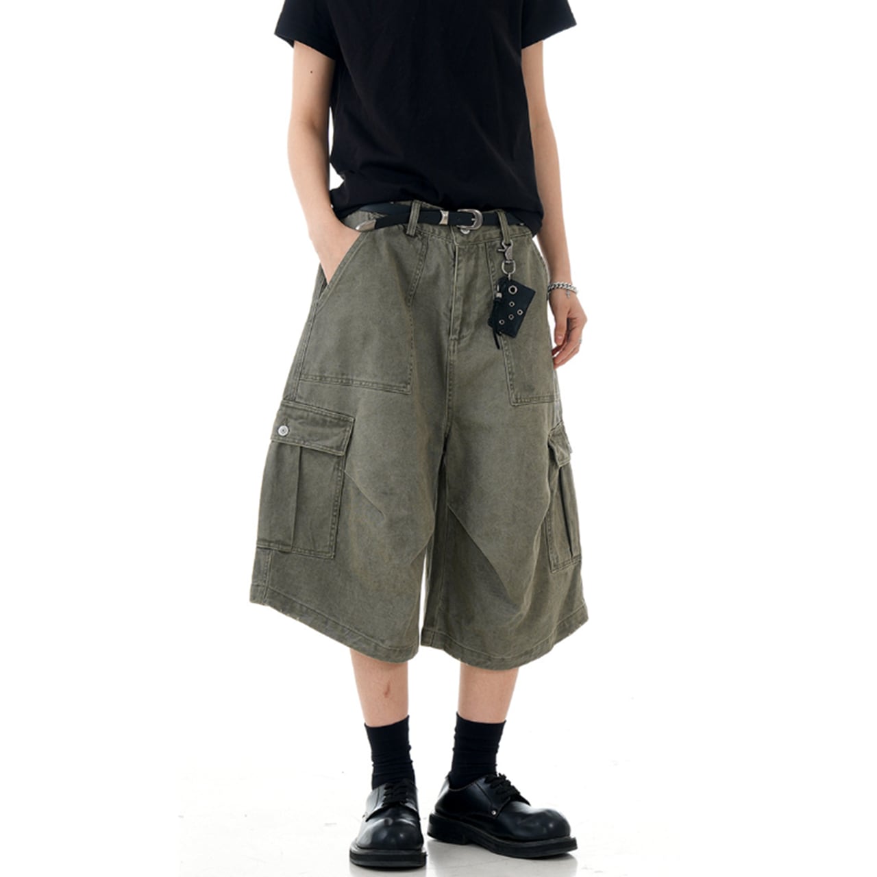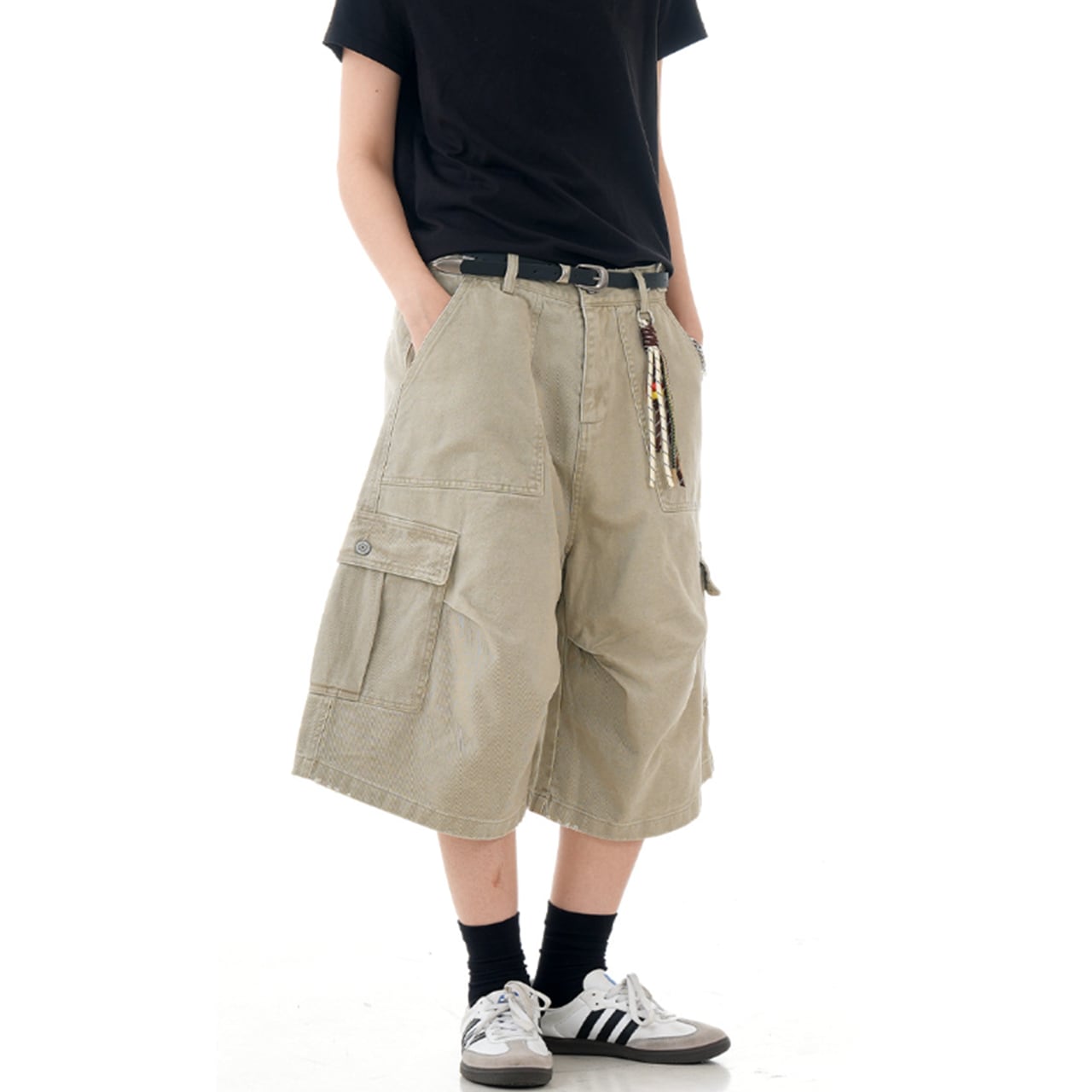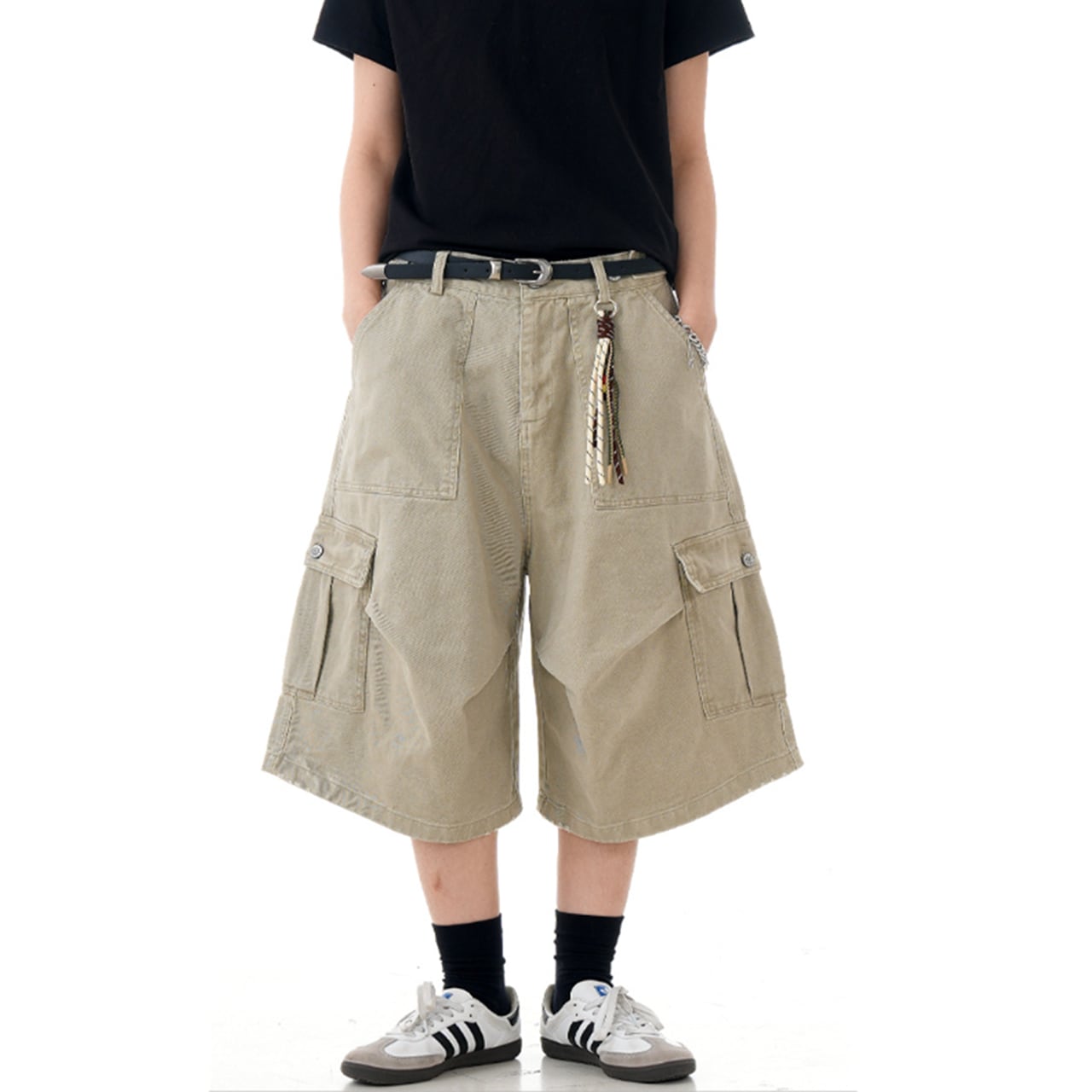 このワイドカーゴ ハーフパンツは、機能的なポケットが特徴のスタイリッシュなアイテムです。ストリートファッションにぴったりなデザインです。カジュアルでありながら存在感を放つ一着です!