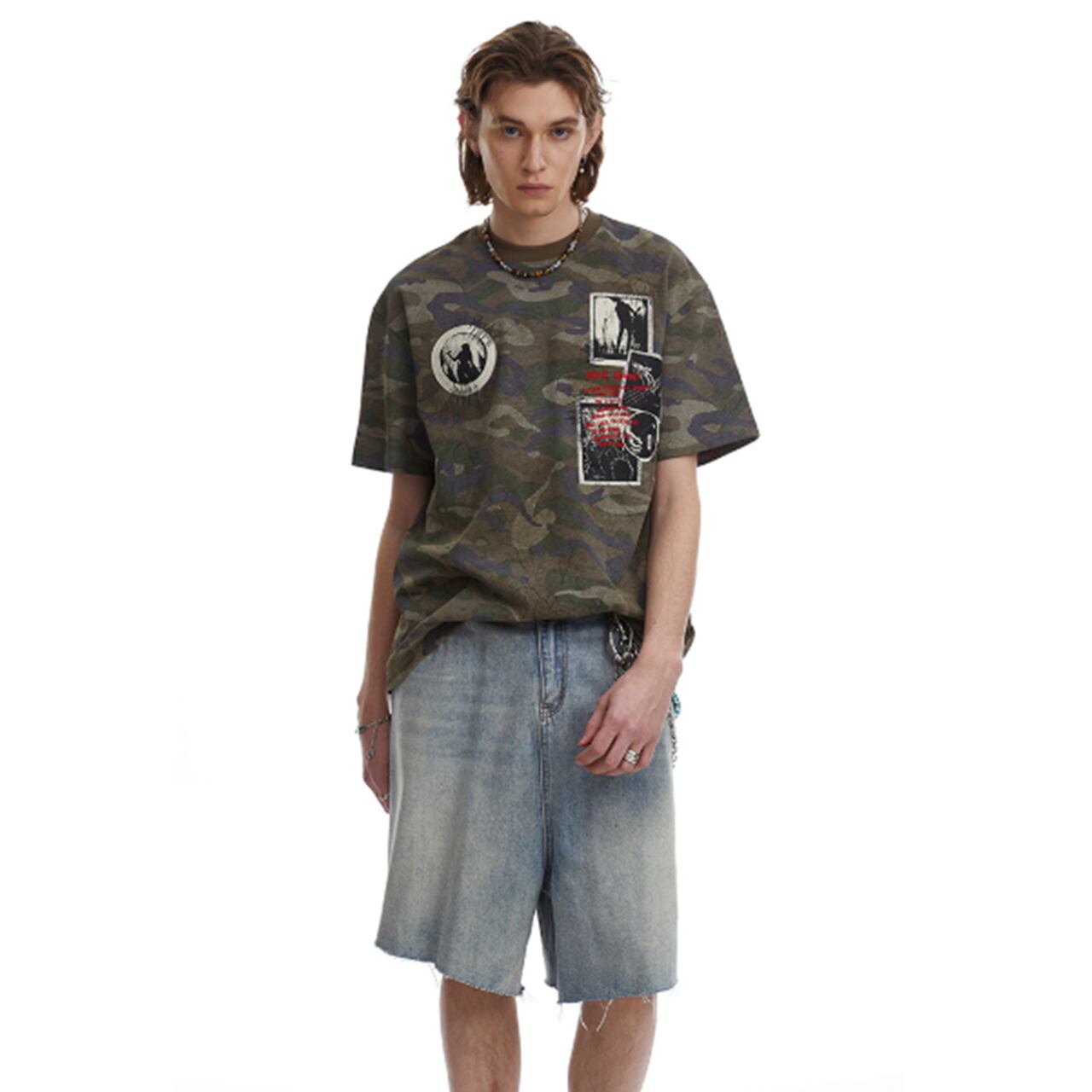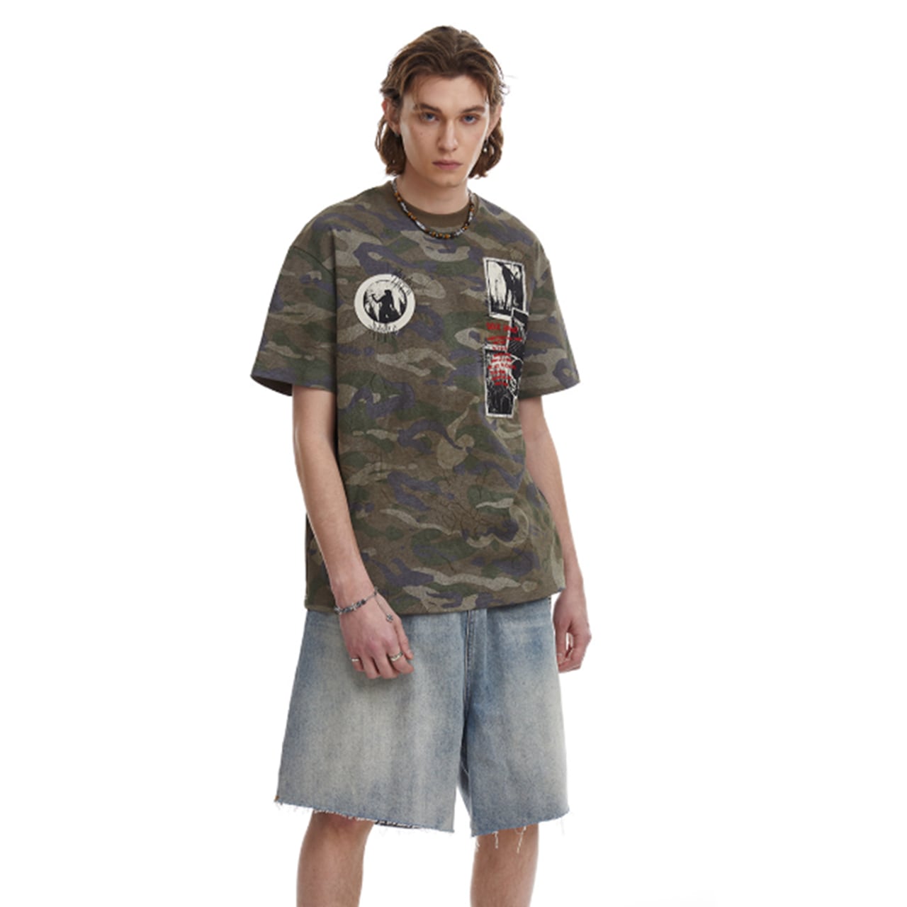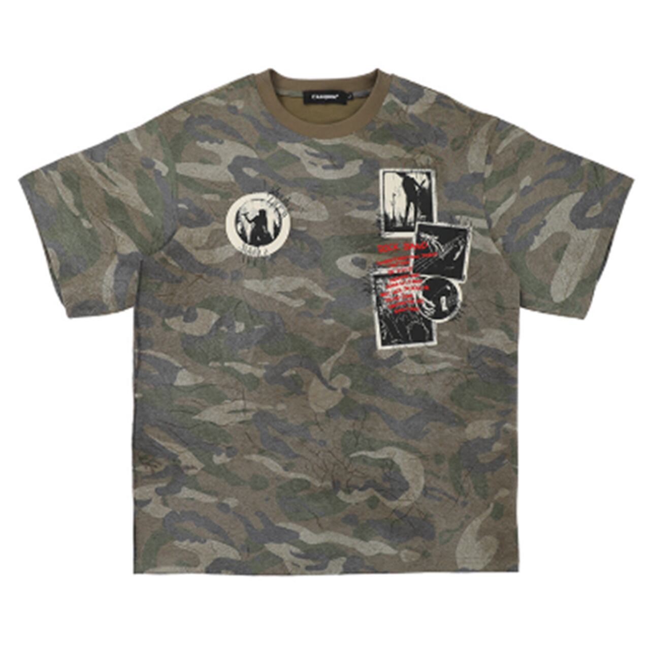 メンズ Tシャツ 半袖 カモ柄 迷彩Tシャツ フォトプリント パッチデザイン ストリートファッション 韓国ファッション y2k メンズコーデ カジュアル オーバーサイズ ビッグシルエット 夏服 春夏 グランジファッション ミリタリーコーデ 古着風