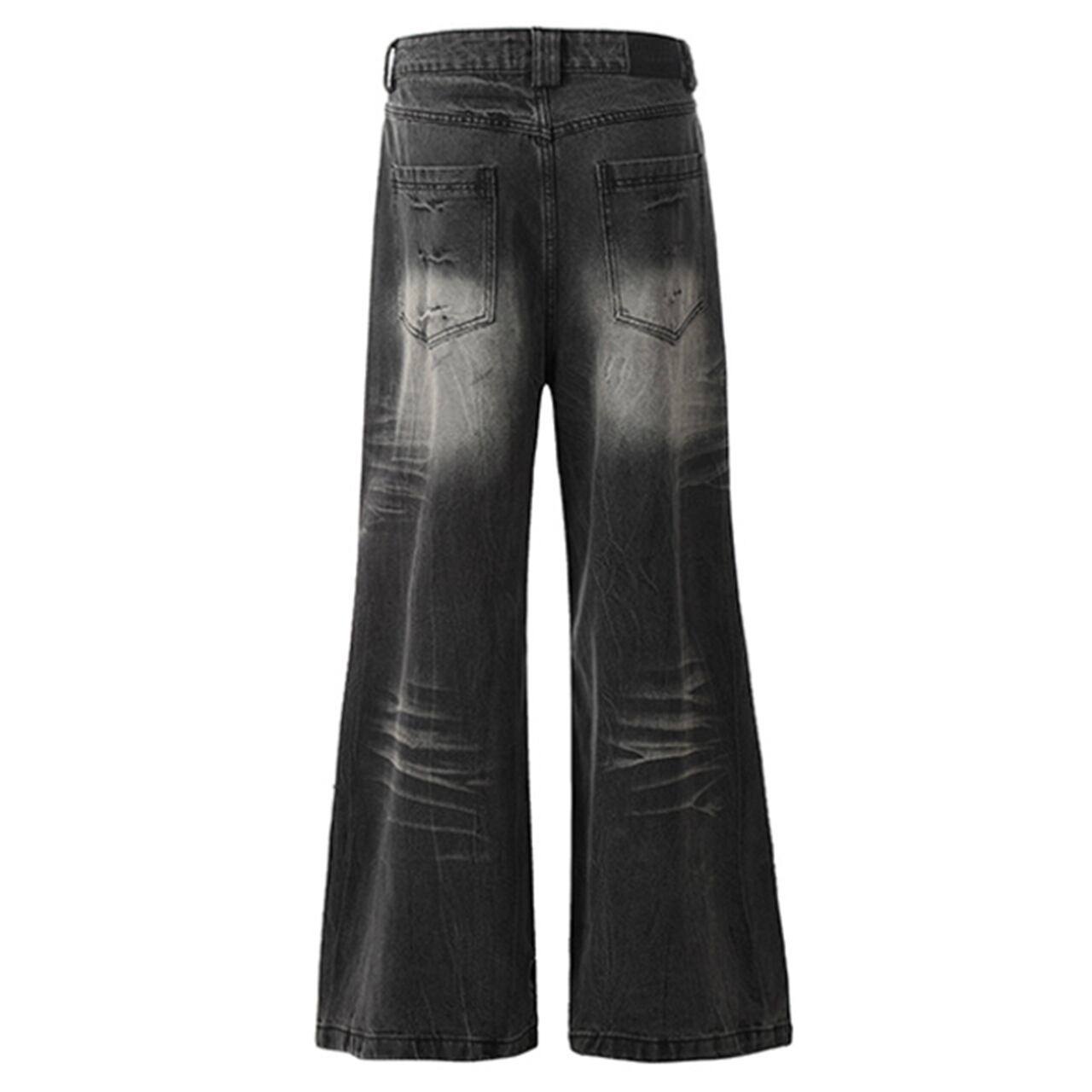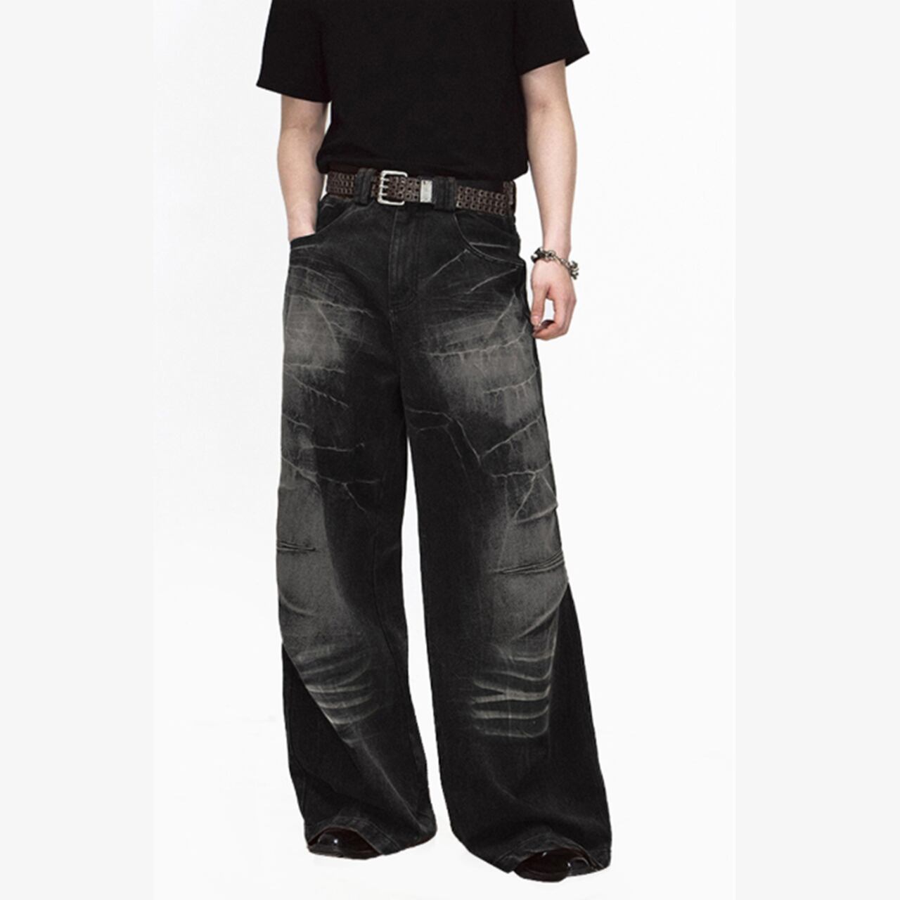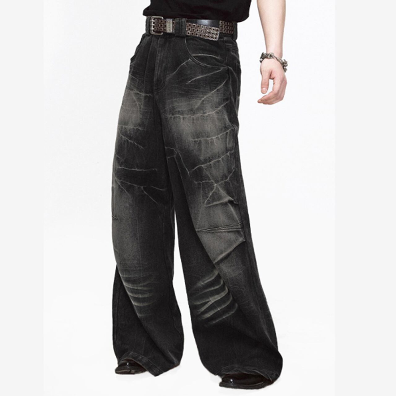 メンズ デニムパンツ ワイドパンツ バギーパンツ ストリートファッション 韓国ファッション メンズコーデ ブラックデニム フェード加工 ウォッシュ加工 ヴィンテージデニム 古着風デニム ルーズシルエット オーバーサイズ カジュアルコーデ モード系 メンズ春夏 秋服 冬服 着回しコーデ ダメージ加工風 ヒゲ加工